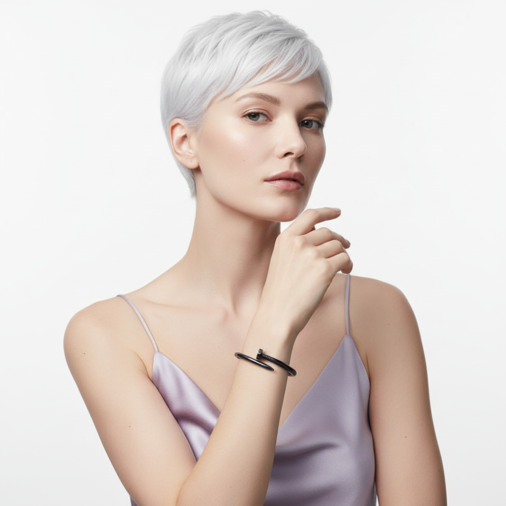 The Juste Un Clou Black Bracelet is a bold reinterpretation of contemporary luxury, crafted in 18K gold vermeil over a 925 sterling silver core. Featuring a 2.5-micron layer of 18K white gold with a black ceramic finish, it combines sleek sophistication with modern edge. Measuring 6.0 mm in width and available in 17 cm and 19 cm circumferences, this bracelet offers a refined fit for any occasion. Durable, hypoallergenic, and strikingly elegant — a timeless statement of style and confidence.