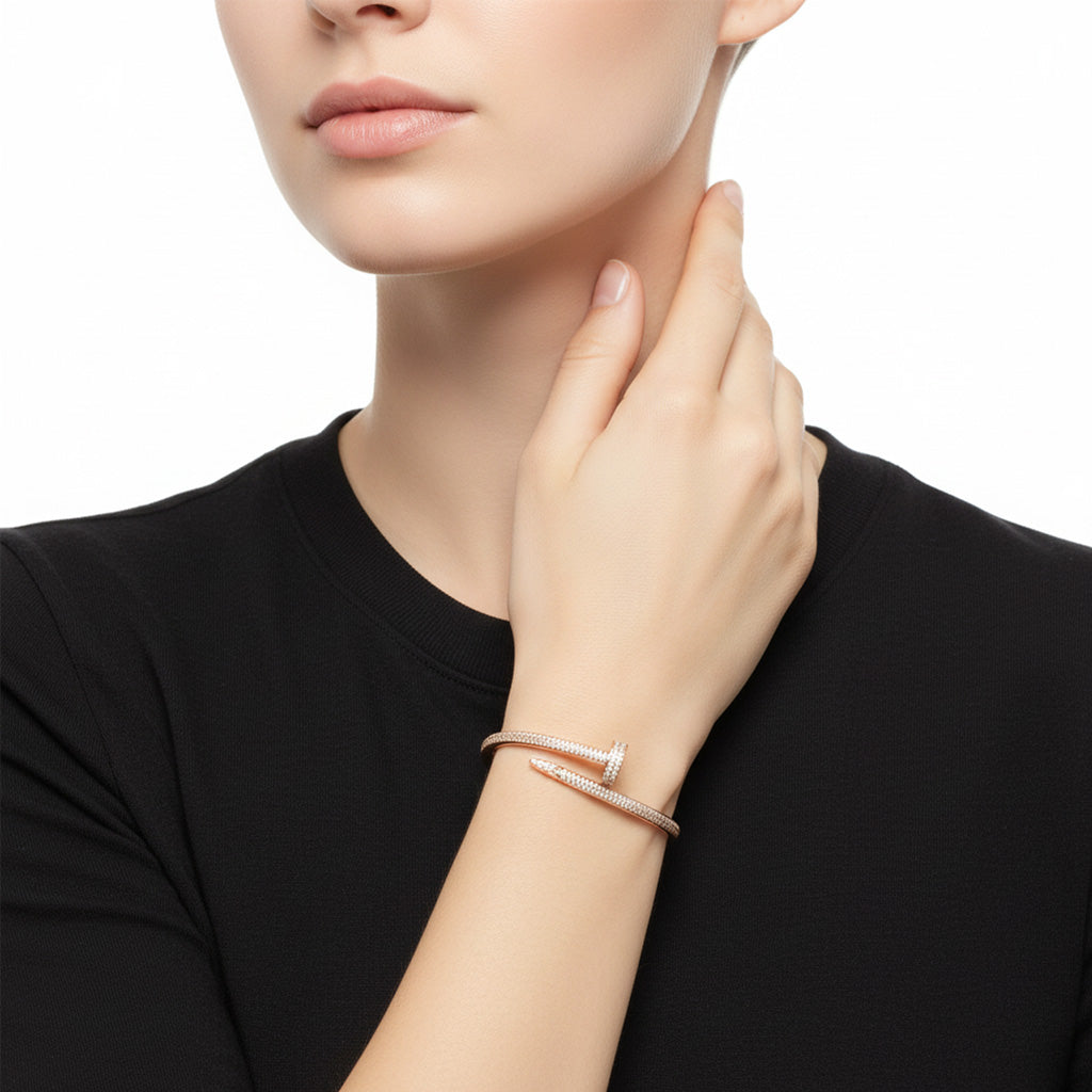 Designed with a 3.5 mm width and encrusted with 2.3 carats of brilliant moissanite, it captures light beautifully, adding a captivating sparkle to any ensemble. Its sculptural silhouette — inspired by the iconic nail design — symbolizes strength, creativity, and refined rebellion.
