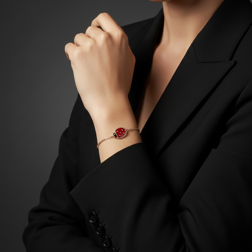 The Lucky Spring Clover Bracelet brings a playful yet refined charm to any jewelry collection. Crafted from 18K rose gold vermeil over a 925 sterling silver core, it features a captivating design adorned with rich carnelian and black enamel details. Measuring 17 cm in circumference, this bracelet offers a comfortable, lightweight fit for everyday wear. Hypoallergenic and durable, it embodies both elegance and joy — a perfect accessory for adding warmth and sophistication to any outfit.