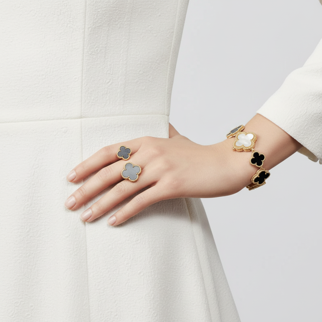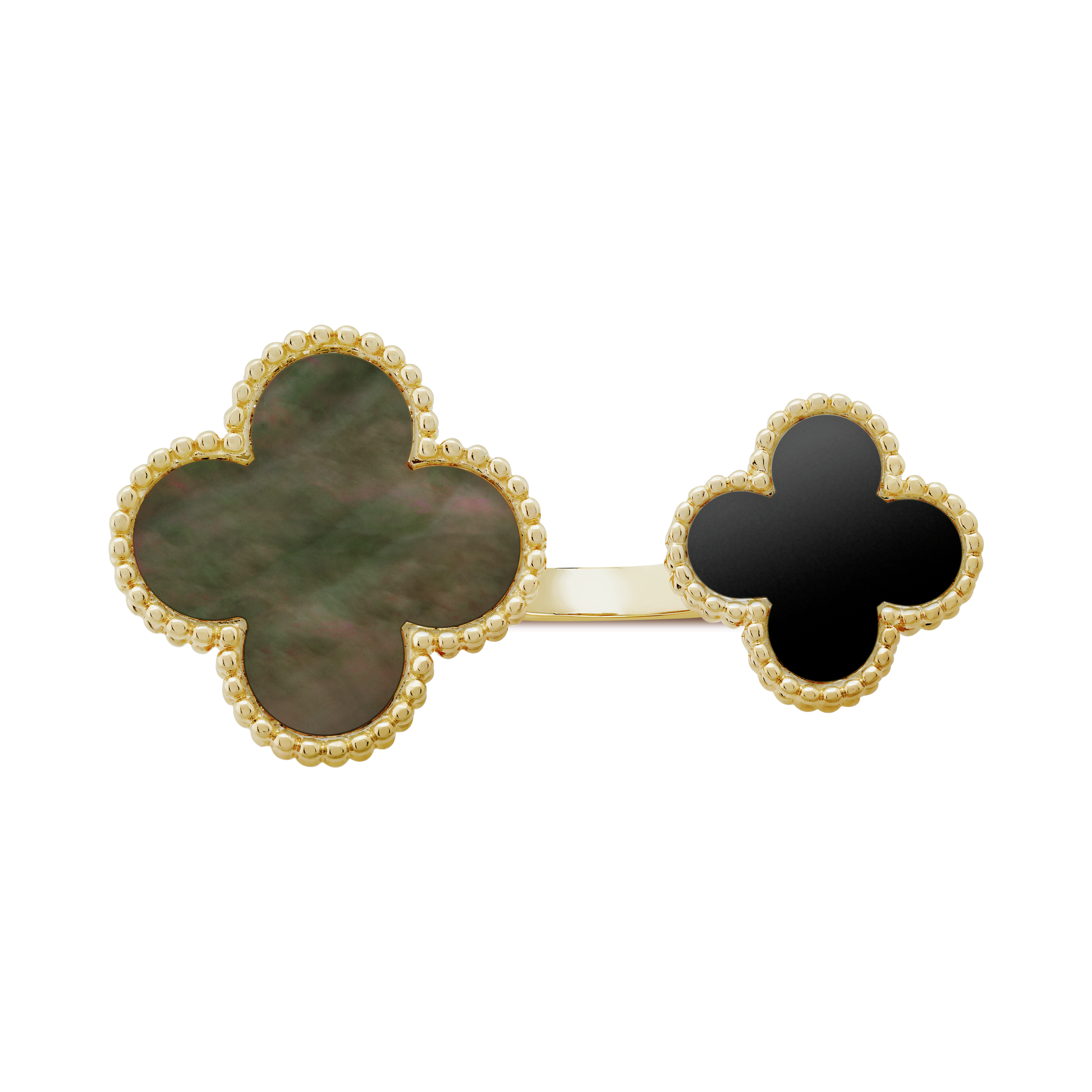 The Magic Alhambra Clover Between The Finger Ring showcases an iconic double-clover design, symbolizing harmony and timeless beauty. Crafted with 925 sterling silver and plated with a thick 2.5-micron layer of 18K gold, this piece offers a radiant finish and enduring quality.