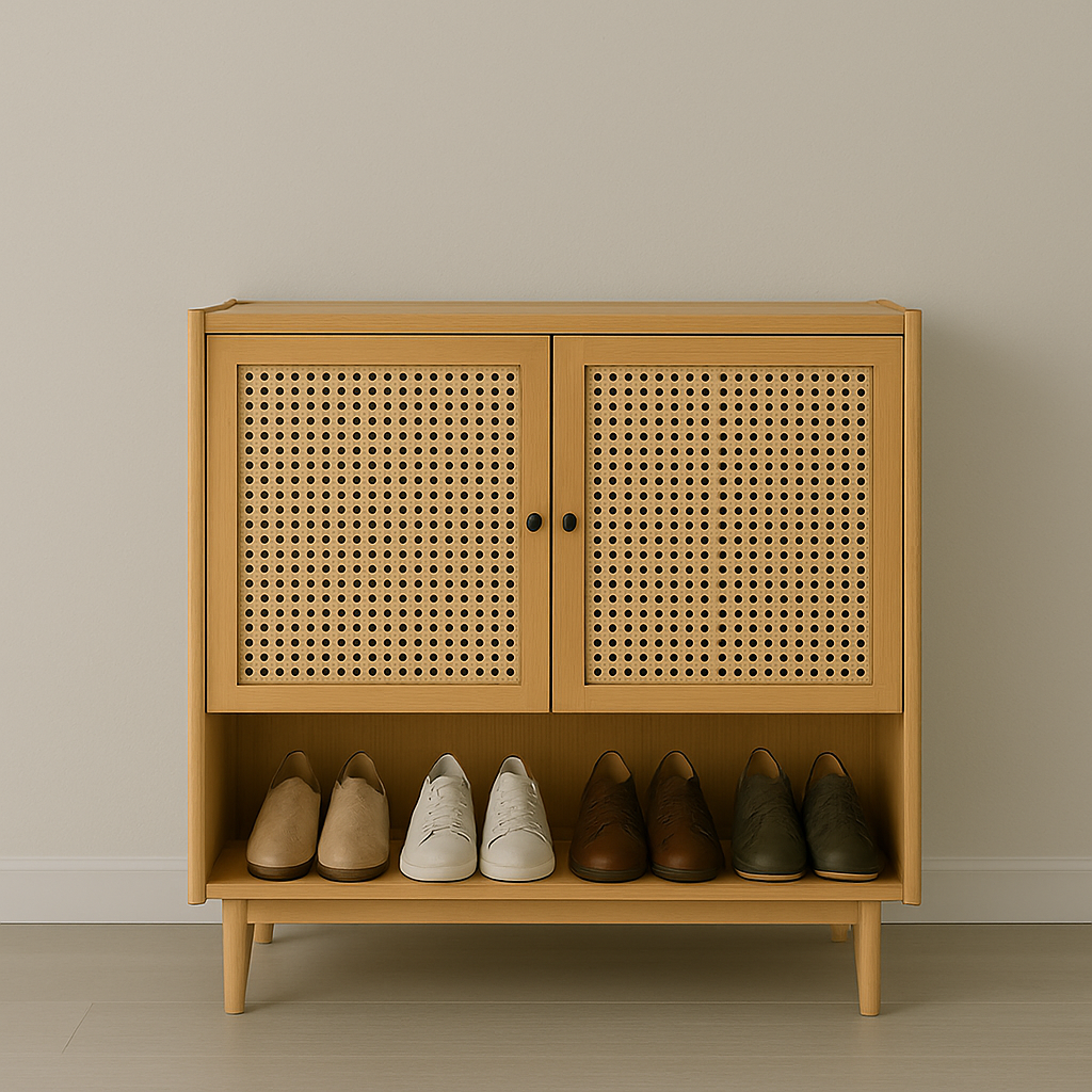 Rattan Door Shoe Cabinet Dual Storage With Open Base Shelf