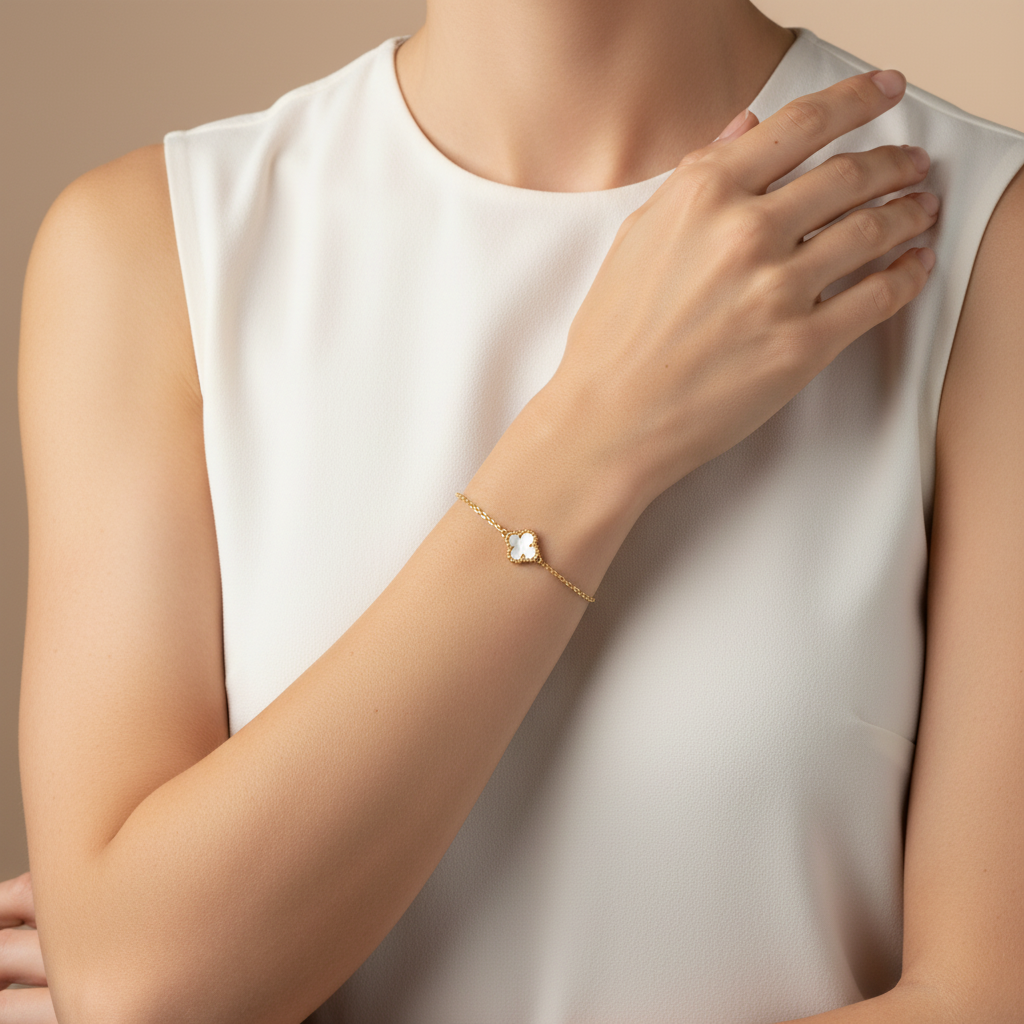 The Sweet Alhambra Bracelet is a delicate expression of elegance and grace. Expertly crafted from 18K Gold Vermeil over solid 925 sterling silver, it features a luminous mother-of-pearl clover motif framed in radiant yellow gold. Measuring 17.5 cm in circumference, this bracelet blends timeless craftsmanship with modern refinement.