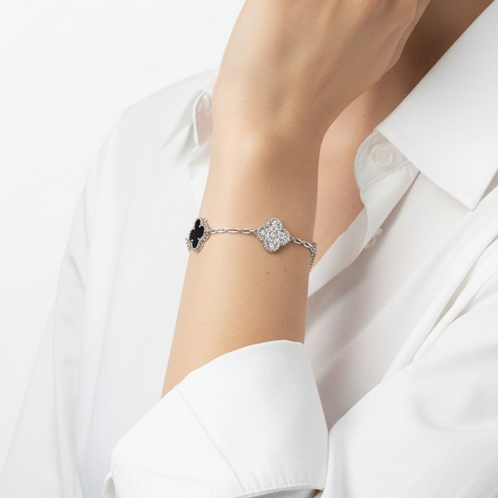 Each of its five clover motifs alternates between deep black onyx and pavé-set diamonds, creating a striking contrast that embodies balance and grace. Measuring 19 cm in circumference, it sits elegantly on the wrist, perfect for both everyday wear and formal occasions.