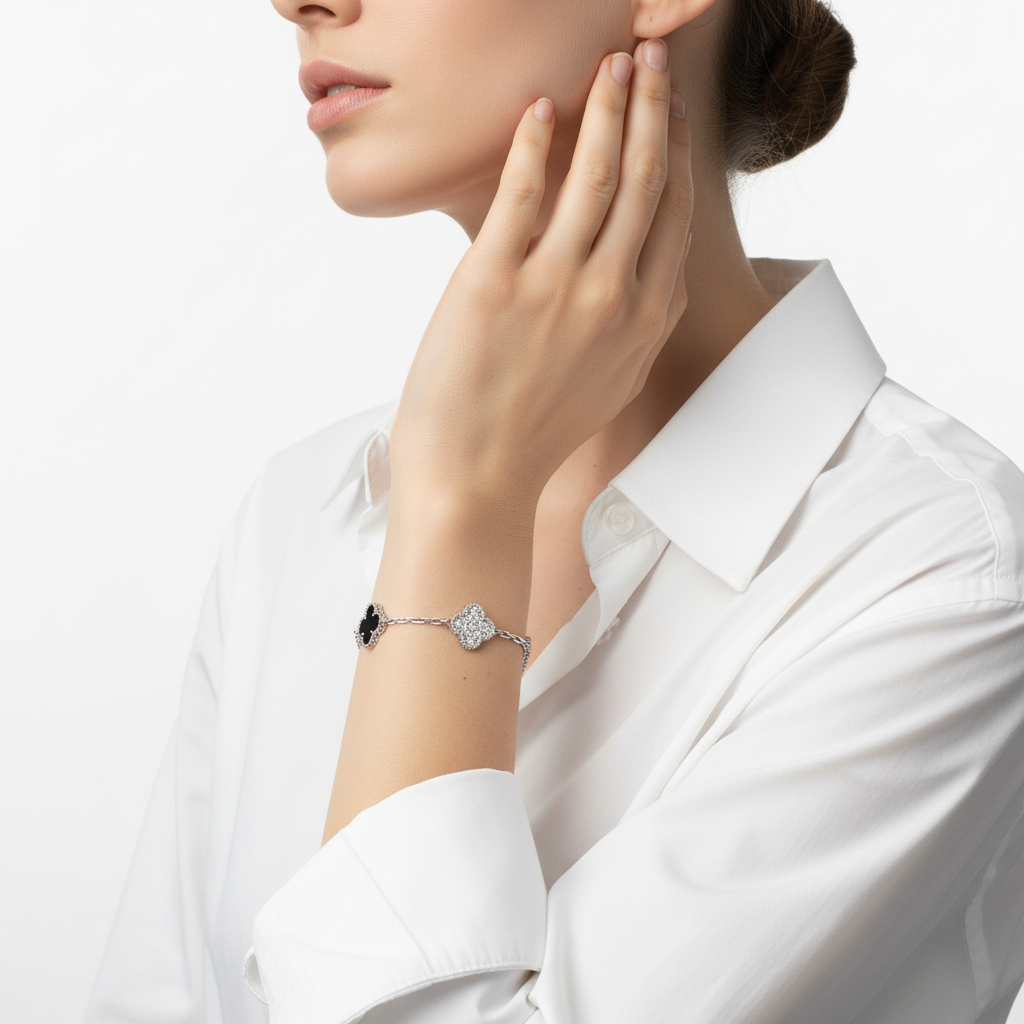 he Vintage Alhambra Five Motifs Black Diamonds Clover Bracelet is a modern expression of luxury and symbolism. Crafted from 18K Gold Vermeil—featuring a 925 sterling silver core coated with a 2.5-micron layer of 18K white gold—this bracelet radiates brilliance and sophistication.