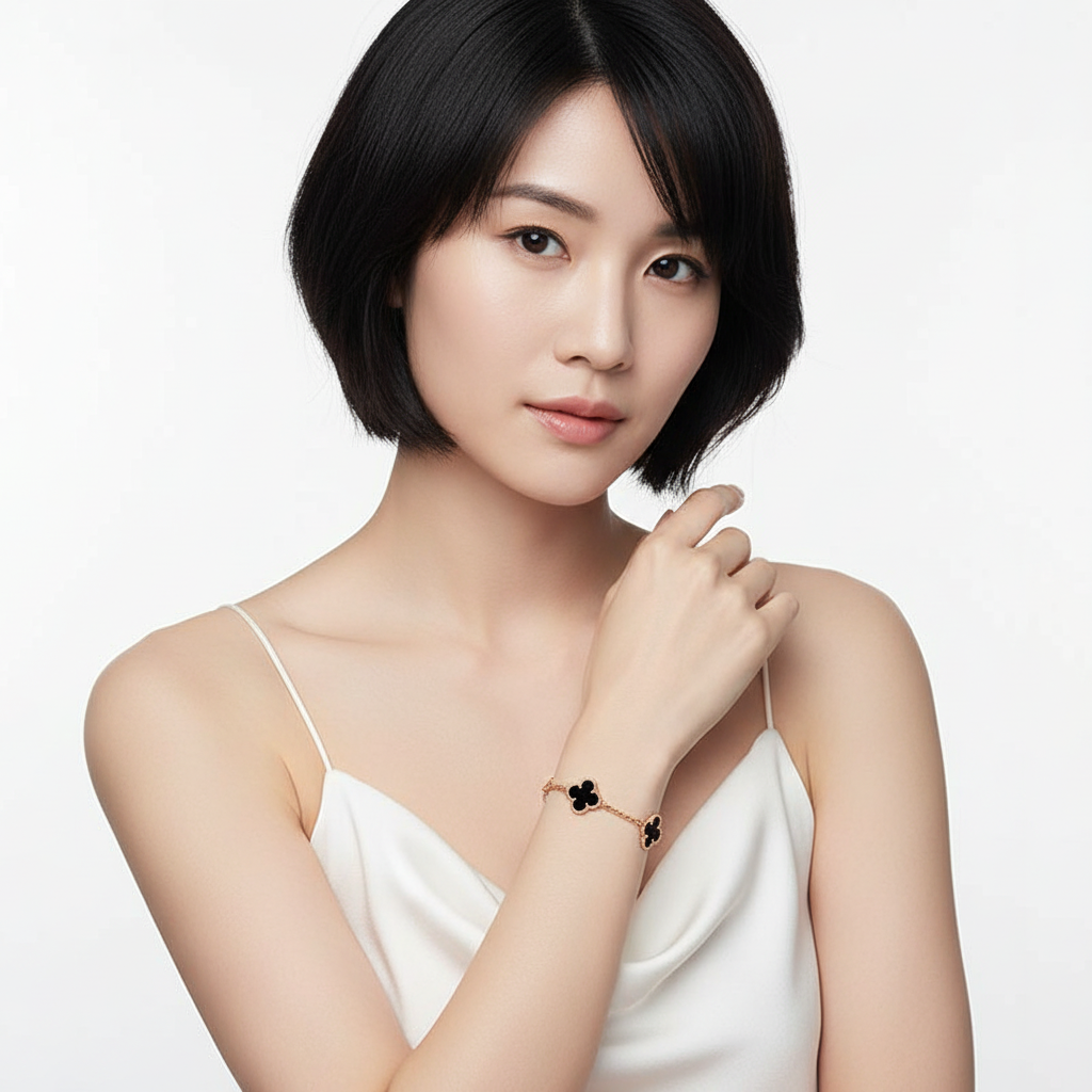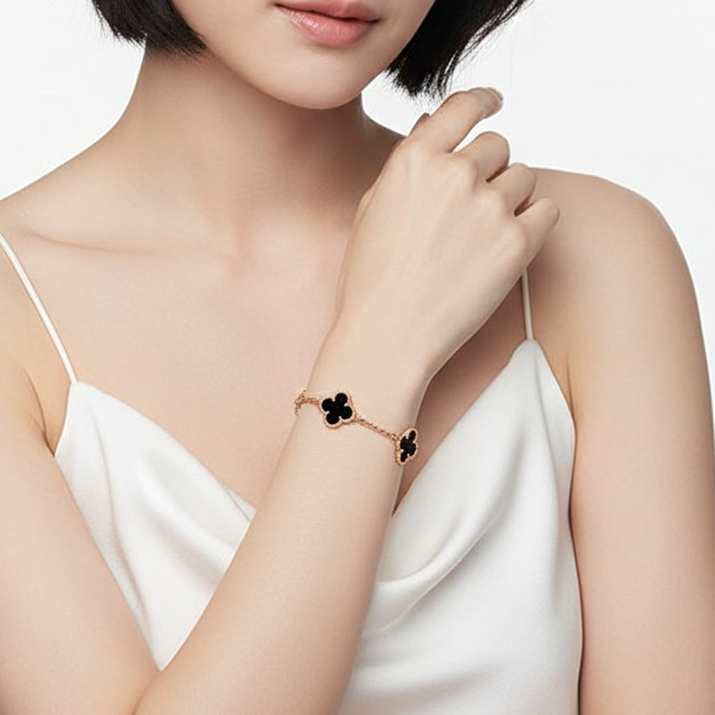 With five black onyx clover motifs, each framed in warm rose gold, the piece symbolizes harmony, protection, and inner strength. Measuring 19 cm in circumference, it drapes gracefully on the wrist, making it perfect for both everyday wear and formal occasions.