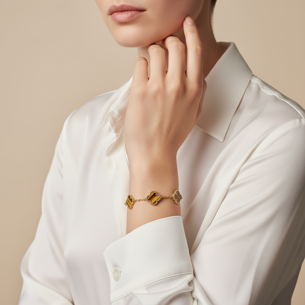 The Vintage Alhambra Five Motifs Tiger Eye Bracelet captures timeless elegance and natural allure. Each of its five clover-shaped motifs is adorned with radiant tiger eye stone, known for its golden-brown hues and protective symbolism. This bracelet brings warmth and confidence to any style—ideal for both casual sophistication and evening refinement.